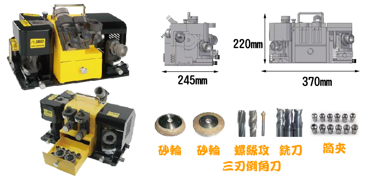●特色:一次解決端銑刀、圓鼻銑刀、螺絲攻、三刃倒角刀的研磨方案。