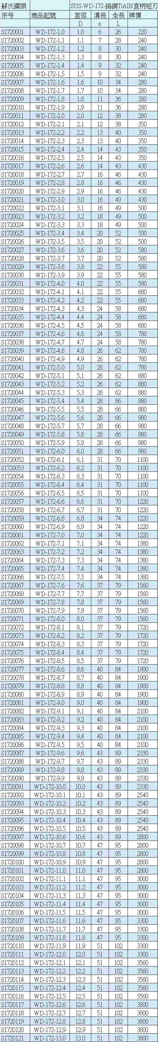 台灣蘇氏SUS-WD-172(TIAIN鎢鋼直柄短刃鑽頭DIN1897)