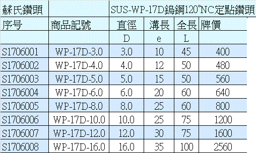 台灣蘇氏SUS-WP-17D(鎢鋼120度NC定點鑽頭)